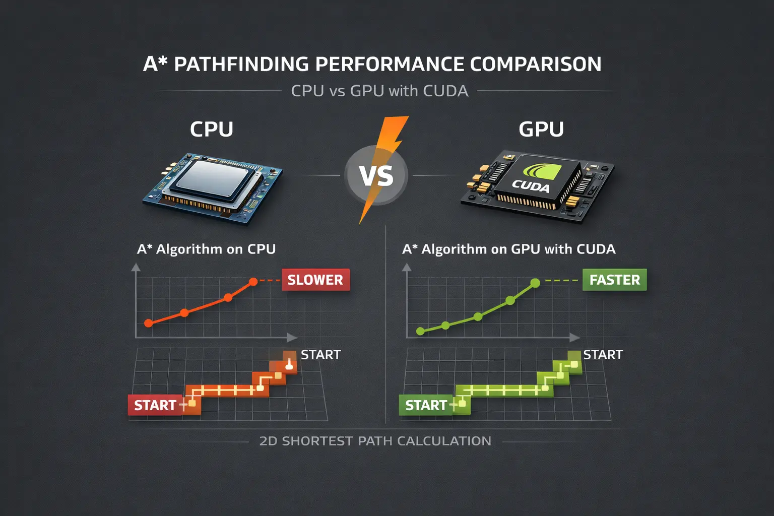 Implementation and performance comparison of the A* pathfinding algorithm CPU-based and GPU-based.