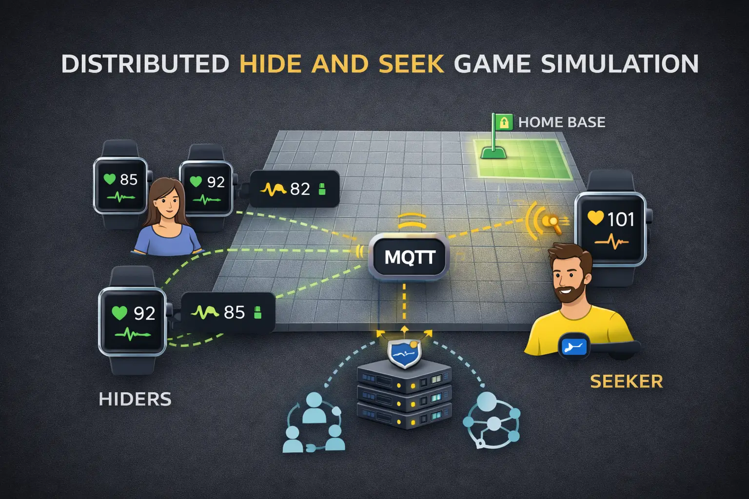 Distributed real-life game simulation inspired by the classic game of hide-and-seek.